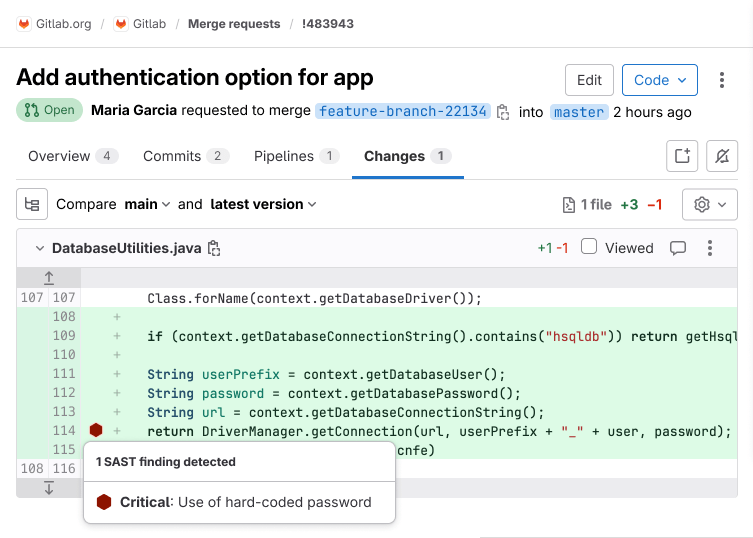 - Merge request changes view: Shows inline annotations for changed lines.